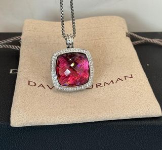 Elegante collar David Yurman con un llamativo colgante, formato de 20mm. Es grande, diseño que ya no se elabora. - Colgante con piedra central de turmalina. - Detalles de pavé de diamantes alrededor del colgante. - Cadena de plata. - Diseño cuadrado con bordes redondeados.