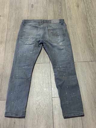 Pantalones vaqueros Bershka de corte skinny con un moderno efecto desgastado y detalles de pintura salpicada. - Efecto desgastado y rotos. - Detalles de pintura en blanco y azul. - Corte skinny. - Talla 36.