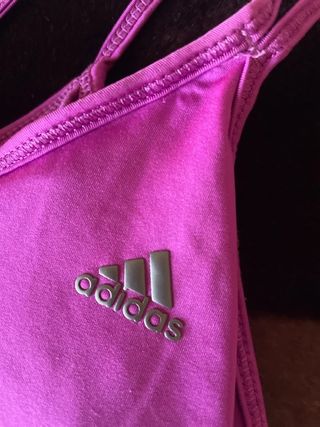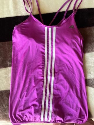 Camiseta deportiva Adidas de color morado vibrante. Diseñada para la comodidad y el estilo. - Tres rayas blancas icónicas en el frente. - Tirantes finos cruzados en la espalda. - Logo de Adidas en gris en la parte superior derecha.