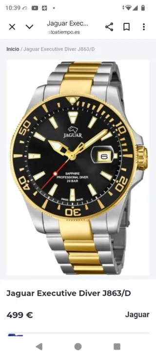 Elegante reloj Jaguar Executive Diver J863/D con una combinación de acero inoxidable y detalles dorados. - Esfera negra. - Bisel giratorio. - Cristal de zafiro. - Resistencia al agua de 20 BAR.
