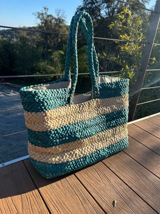 Bolso de playa con un diseño de rayas llamativo. Perfecto para llevar tus esenciales. - Espacioso y grande - Material tejido. - Asas trenzadas.