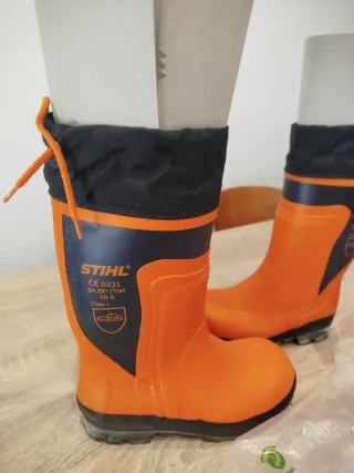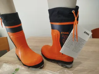 Botas de agua Stihl en color naranja y negro. Perfectas para trabajos en exteriores o actividades que requieran protección. - Diseño alto para mayor cobertura. - Cierre ajustable en la parte superior. - Suela antideslizante.