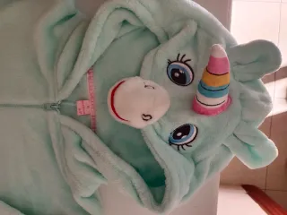 Disfraz de unicornio con capucha, ideal para adultos. El diseño es divertido y llamativo. - Color principal verde menta. - Detalle de cuerno multicolor en la capucha. - Orejas y detalles bordados en la cara del unicornio.