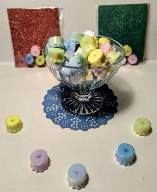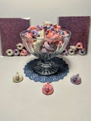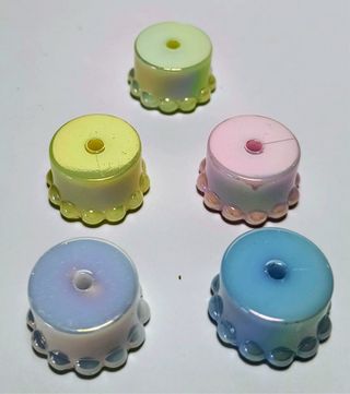Lote de abalorios acrílicos galvanizados con un diseño encantador y colores pastel. - Diseño de pastelitos. - Acabado iridiscente. 21x13mm, 3mm haz. 5 unidades pack
