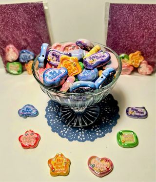 Lote de abalorios acrílicos galvanizados con forma de cartelitos. - Diseños variados con mensajes. - Tonos azules y morados predominantes. Diferentes formas 25x25mm aprox., 2mm haz. 5 unidades pack
