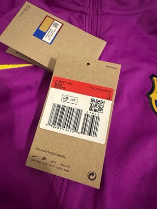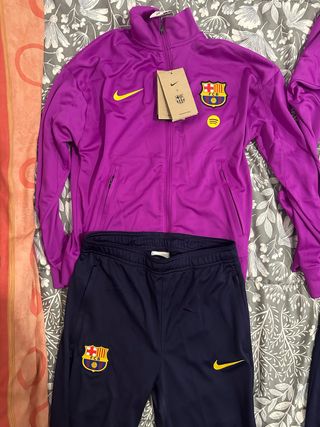 Conjunto de chándal del FC Barcelona. - Chaqueta morada con cremallera completa. - Pantalón azul. - Escudo del FC Barcelona bordado en ambas prendas. - Logo de Nike en amarillo. TALLA 10-12 kids TOTALMENTE NUEVO, lo vendo por falta de tiquet
