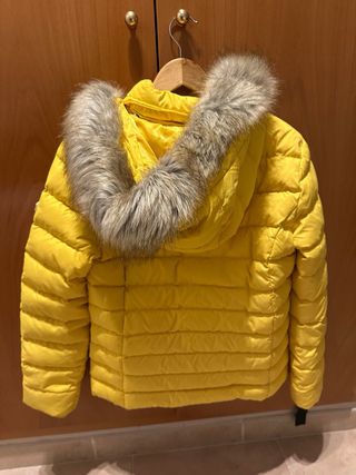 Chaqueta acolchada con capucha y detalles de pelo sintético. - Cierre de cremallera frontal. - Bolsillos laterales con cremallera. - Puños elásticos.