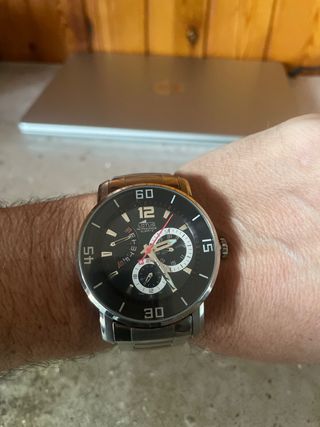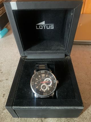 Elegante reloj de la marca Lotus con una combinación de colores negro y plateado. - Diseño moderno y sofisticado. - Caja y correa de metal. - Esfera con detalles en rojo.