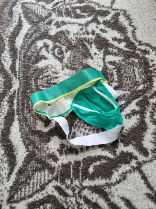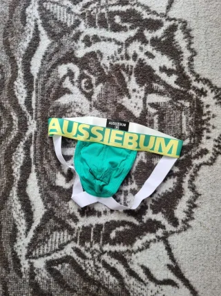 Suspensorio de la marca Aussiebum en color verde. - Talla M (equivalente a 38-40 / 48-50). - Diseño con cintura elástica y tiras blancas.