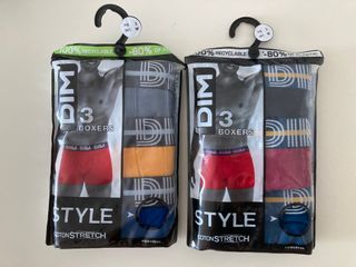 Nuevos, en pack original. Multicolor. Talla: L (Francia: 4). Cintura elástica con estampado de la marca DIM. Composición: 96% algodón + 4% elastano. Tecnología DIM Anatomic, diseñada para adaptarse de forma óptima a la anatomía genital masculina. Para sentirse más cómodo.