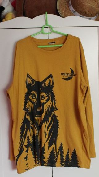 Pijama de manga larga con un diseño de lobo .Pantalon en color verde oliva - Estampado frontal de lobo y bosque. - Cuello redondo. - Manga larga.