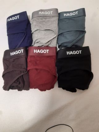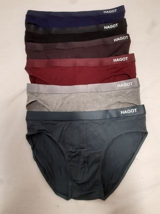 Pack de 6 slips de la marca Hagot. - Cintura elástica con logo. - Tejido suave y transpirable (95% microfibra, 5% spandex). - Medidas: 38 cm (caderas); 26.5 cm (largo). - colores: verde oscuro, marrón oscuro, azul oscuro, negro, granate y gris.