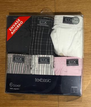 Pack de 6 calzoncillos tipo boxer para hombre de tela de la marca TEXbasic de Carrefour. Sólo se ha extrañido del pack el blanco para hacer las foto. - Cintura elástica con logo. - Tejido tela no ajustable. - Composición: 100% algodón. - Diseño con estampado de cuadros, rayas y liso. - Cierre de botón. - Talla SG - 50-56. - Medidas: 76 cm de cintura, 36 cm largo Por supuesto, todo sin estrenar.