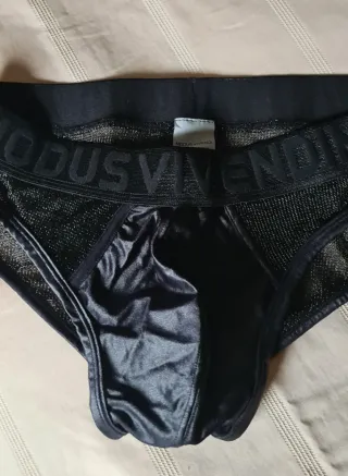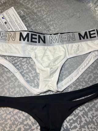 Conjunto de ropa interior que incluye un tanga y un suspensorio. - Tanga de color negro. - Suspensorio de color blanco con banda elástica.