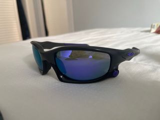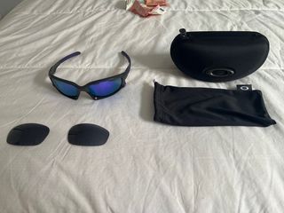 Se venden gafas deportivas Oakley con lentes intercambiables y funda protectora. - Montura negra y morada. - Lentes azules reflectantes. - Incluye dos lentes adicionales. - Funda rígida negra. - Bolsa de tela negra.