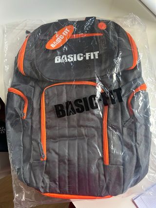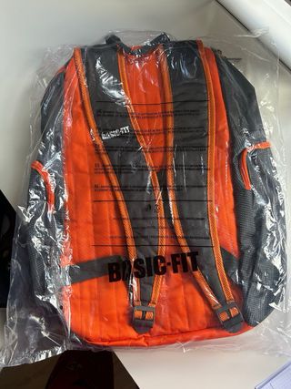 Mochila de la marca Basic Fit con un diseño moderno y práctico. - Color principal gris con detalles en naranja. - Compartimentos exteriores con cremallera. - Asa superior para colgar.