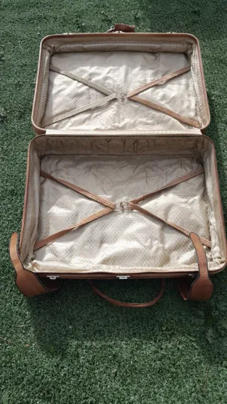 Conjunto de viaje Bianchi que incluye una maleta, un neceser y una funda para trajes. Piezas de cuero en tonos marrones y beige. - Maleta de mano con asa y cierre de hebilla. - Neceser a juego. - Funda para trajes con cremallera y asas.