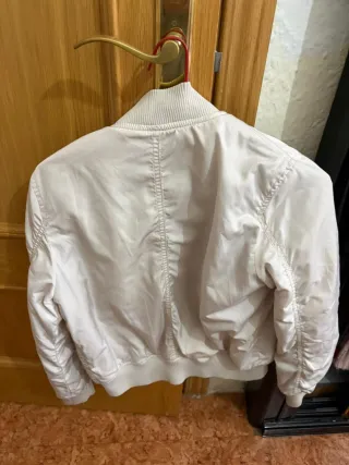 Chaqueta estilo bomber en color beige. - Cierre de cremallera frontal. - Bolsillos laterales con botón. - Bolsillo con cremallera en la manga. - Puños y bajo elásticos.