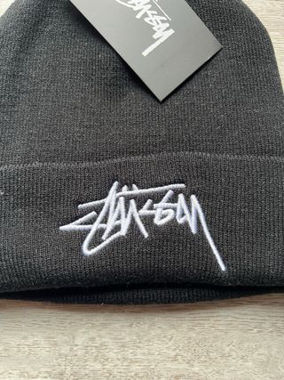 Gorro de lana Stüssy en color negro. Un accesorio clásico y versátil. - Logo de Stüssy bordado en blanco en la parte frontal. - Tejido de punto suave y cómodo.