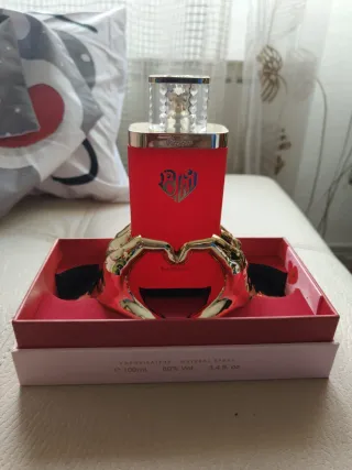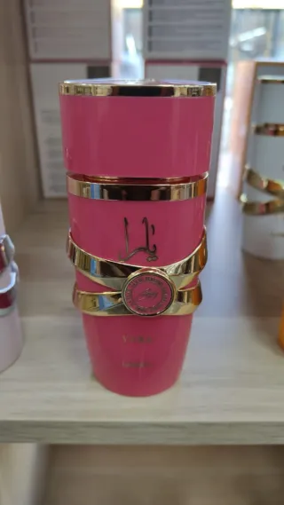Elegante fragancia femenina con un diseño llamativo. - Envase cilíndrico en color rosa. - Detalles y adornos en acabado dorado. - Inscripción en árabe en la parte frontal.