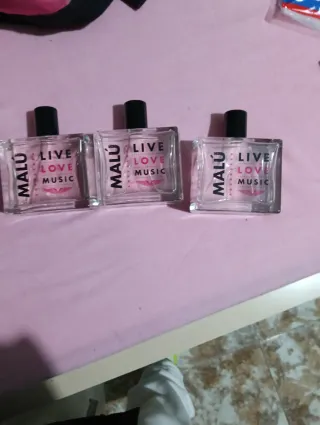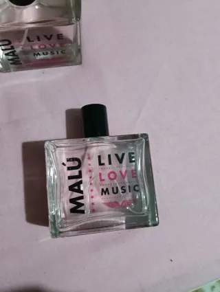Perfume de la marca Malú con la fragancia Live Love Music. El frasco es de cristal transparente con detalles en rosa y negro. - Cada una son 15€ si coges las tres te sale más rentable . - Diseño del frasco: cuadrado. - Etiqueta con texto MALÚ LIVE LOVE MUSIC y un diseño de alas.