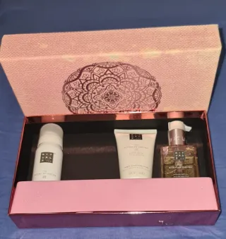 Set de cuidado corporal de la línea Rituals of Sakura. Falta un producto - Incluye limpiador espumoso, crema corporal y aceite corporal. - Presentado en una caja decorativa. - Diseño con detalles en dorado y rosa.