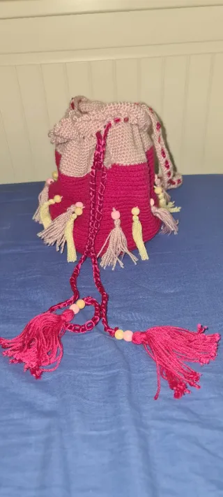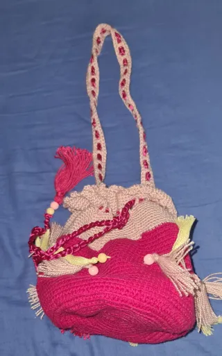 Bonita bolsita tejida a mano con un diseño único y adornos. - Elaborada con la técnica de crochet. - Detalle de flecos y cuentas. - Cierre de cordón.