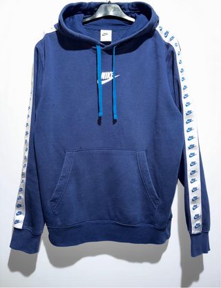 ✨ Sudadera Nike Sportswear con Logo en Cinta Azul Marino Estilo Y2K • 🏷️ Talla: S • 📏 Medidas: Ancho 54 cm, Largo 68 cm • 🌈 Color: Azul marino (Navy) con detalles en celeste y cinta lateral blanca • ✅ Estado: 9/10. • 🔎 Detalles principales: Diseño con cinta lateral (branded tape) en las mangas con logos repetidos. Logotipo Nike bordado en el centro del pecho. Capucha ajustable con cordones en contraste color azul brillante. Bolsillo tipo canguro funcional.
