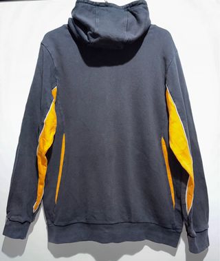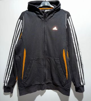 Adidas Chaqueta con Capucha Estilo Deportivo Gris y Naranja Y2K 🏷️ Talla: S 📏 Medidas: Axila a axila: 53 cm | Largo total: 70 cm 🌈 Color: Gris oscuro / Antracita con detalles en naranja vibrante y bandas blancas. ✅ Estado: 8/10 (En muy buen estado vintage. El color gris presenta una ligera pátina de uso que le da un carácter auténtico, sin manchas ni roturas visibles). 🔎 Detalles principales: • Logotipo de Adidas bordado en el pecho. • Cierre de cremallera completa (Full Zip). • Paneles laterales en contraste naranja que estilizan la figura. • Clásicas tres bandas de la marca en las mangas. • Tejido de algodón cómodo