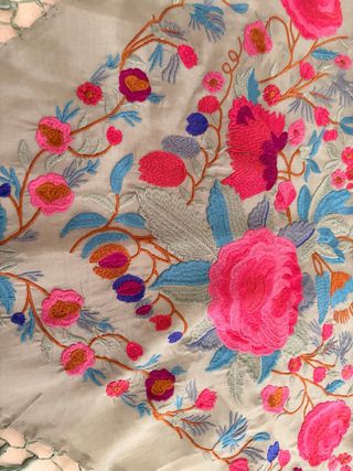 Elegante mantoncillo de seda con un delicado bordado floral. Perfecto para añadir un toque especial a cualquier atuendo. - Material: Seda. - Diseño: Flores bordadas en tonos vibrantes. - Adorno: Flecos largos en los bordos. Ancho 94 cm Largo 45 cm Flecos 15 cm