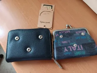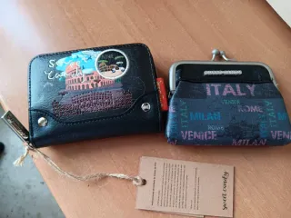Monedero con diseño inspirado en Italia, con nombres de ciudades como Roma, Venecia -Monedero y tarjetero dos en uno - Cierre y separación con broche - Estampado multicolor sobre fondo oscuro. Todo el embalaje original