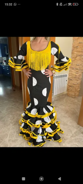 Traje de flamenca en buen estado, con un diseño llamativo. - Mangas con volantes. - Adorno de flecos amarillos en el escote. - Falda con múltiples volantes.