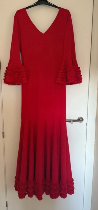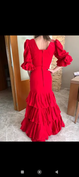 Traje de flamenca o bata rociera de color rojo, elastıca con cremallera a la espalda Super cómoda y ligera no pesa nada