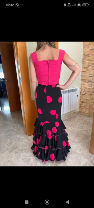 Conjunto de falda y cuerpo de flamenca con un diseño llamativo. - Cuerpo de color rosa con pequeños topos. - Falda larga negra con grandes lunares rosas. - Volantes en la parte inferior de la falda.