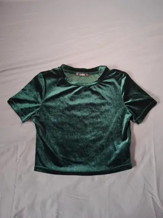 Top de terciopelo en color verde, con un tacto suave y agradable. - Diseño de manga corta. - Cuello redondo.