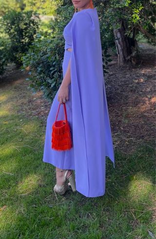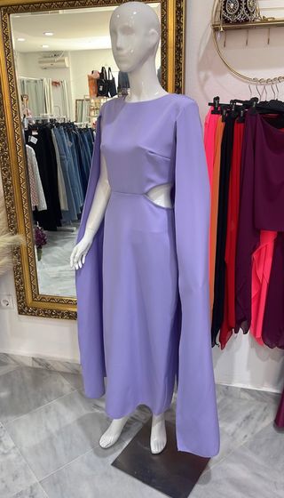 Elegante vestido largo en color malva, perfecto para eventos especiales. Diseño moderno con detalles cut-out en los laterales y mangas tipo capa. Capa abierta por detrás. Cierre trasero com cremallera. Tela un poco elástica. - Corte asimétrico. - Tejido fluido. Usado una sola vez.