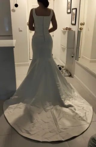 Vendo vestido de novia Luna Novia (grupo Rosa Clará) completamente nuevo y sin usar. Es un diseño elegante y atemporal de corte sirena con tejido liso y una preciosa espalda de encaje floral que aporta un toque romántico y muy especial. El vestido se encuentra en estado perfecto, sin arreglos ni modificaciones, lo que permite adaptarlo fácilmente a medida. Detalles: • Marca: Luna Novia (grupo Rosa Clará) • Talla: 48 • Estado: nuevo, sin estrenar • Corte: sirena con caída fluida • Manga corta de encaje • Espalda de encaje transparente con bordado floral • Cola ligera y elegante • Color: blanco marfil Es un vestido muy favorecedor