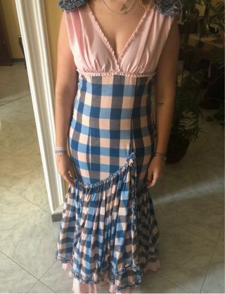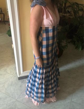Traje de flamenca único, confeccionado a medida. Un diseño original con un estampado de cuadros vibrante. - Cuerpo superior en tono rosa pálido. - Falda con volantes y detalle de volantes. - Adornos en los hombros.