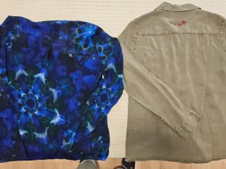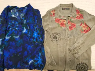 Dos camisas de la marca Desigual con diseños únicos. Se venden juntas o por separado. 20€/unidad. 30€ las dos juntas. - Camisa azul con estampado abstracto. Talla XL entallada. - Camisa verde militar con bordados florales y detalles de mandala. talla M