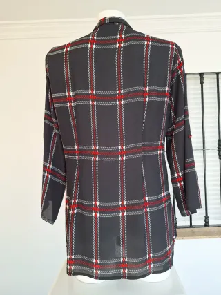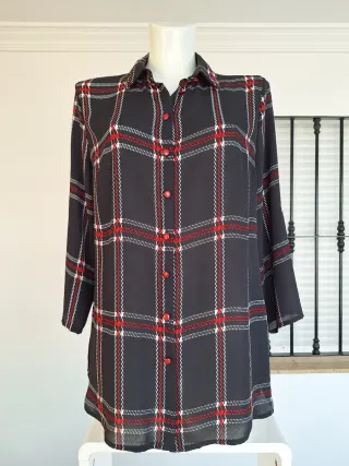 Camisa con estampado de cuadros en tonos negros, rojos y blancos. Su tejido es ligero y semitransparente, ideal para superponer. 100% poliéster Medidas: - Ancho: 52 cm - Hombro: 41 cm - Manga: 52 cm - Largo: 72 cm