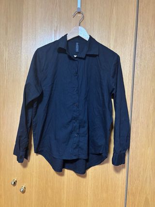Camisa negra de corte oversize. - Diseño holgado. - Cuello camisero. - Cierre de botones. - Puños anchos con botones.