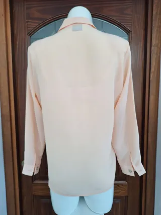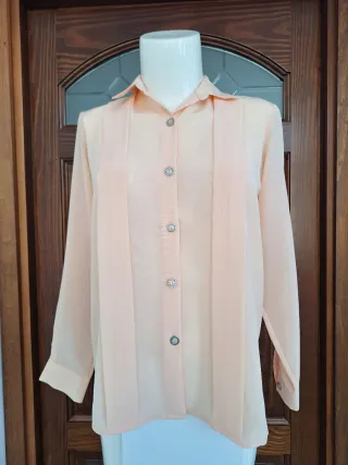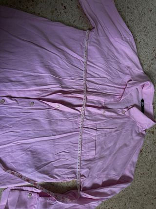 Elegante camisa de manga larga en tono rosa. Perfecta para cualquier ocasión. Diseño con botones frontales, cuello clásico y tejido ligero. Tiene una pequeña mancha negra en la parte de detrás del cuello, se aporta fotografía. 100% poliéster. MEDIDAS: - Largo: 67 cm - Ancho: 58 cm