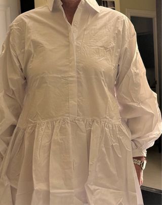 Camisa blanca de manga larga con un diseño moderno y favorecedor. - Cuello camisero clásico. - Puños abotonados. - Falda con volantes.