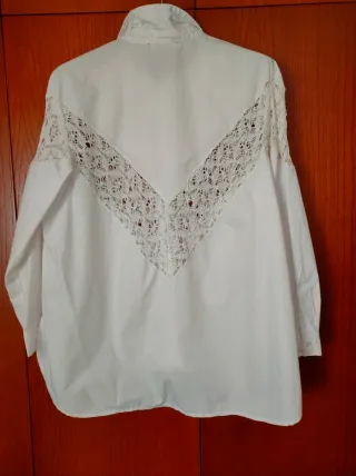 Camisa blanca con un diseño de encaje en la parte delantera y en las mangas. - Cuello camisero. - Cierre de botones. - Mangas largas. Aunque marca la talla M, es desde mi punto de vista una L o incluso XL, porque talla bastante. Pedir medidas si no s necesario