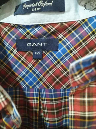 Camisa de manga larga para hombre con estampado de cuadros con líneas rosa, verde, azul oscuro sobre blanco. Talla 4/L. Ancho hombros 46.5cm, ancho cuerpo 56cm, largo cuerpo 66cm, largo mangas 67.5cm. Tiene etiquetas.