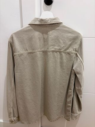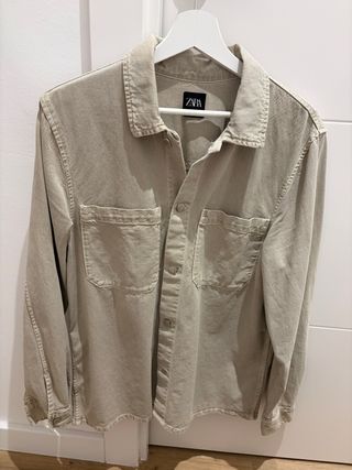 Camisa de manga larga de la marca Zara en color beige. Presenta un diseño clásico con cuello y cierre de botones. - Dos bolsillos en la parte frontal. - Costuras visibles en los bordes.