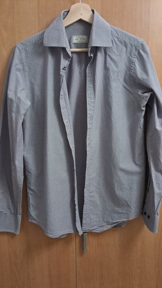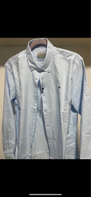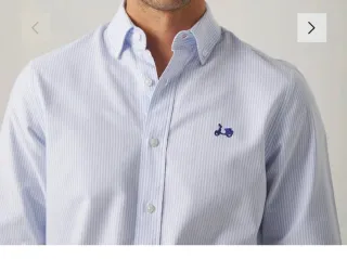 Camisa de manga larga con un diseño de rayas finas en azul y blanco. Presenta un pequeño bordado de una moto en el pecho. - Cuello camisero con botones. - Cierre de botones. - Puños abotonados. Vendo por haber adelgazado y gasto una M. Usada 3 veces exactas, como nueva.
