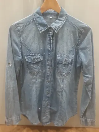 Camisa vaquera de corte entallado, con un diseño moderno y detalles brillantes. - Adornos plateados distribuidos por toda la prenda. - Cuello clásico y cierre de botones. - Dos bolsillos en el pecho con solapa y botón.