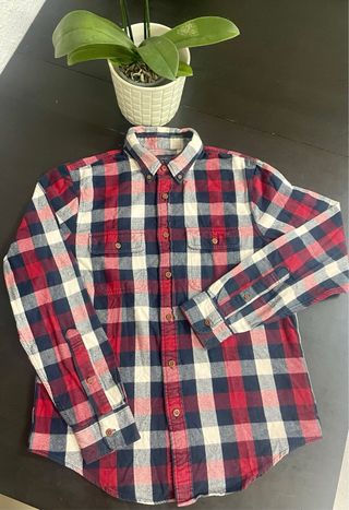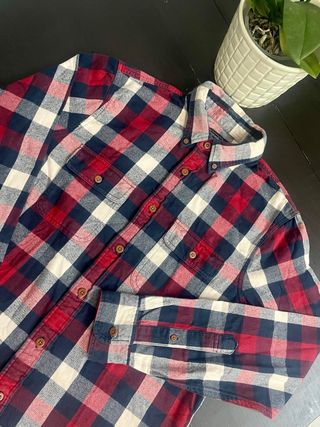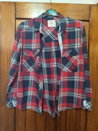 Camisa de cuadros de Bershka. Tiene un patrón de cuadros en tonos rojos y azul marino. Dos bolsillos en la parte delantera.