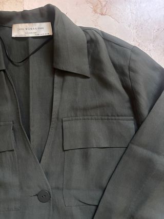 Camisa de Zara Woman Studio en color verde oliva. Presenta un diseño elegante y moderno. - Cierre de botón. - Dos bolsillos en la parte delantera. - Puños con botón.
